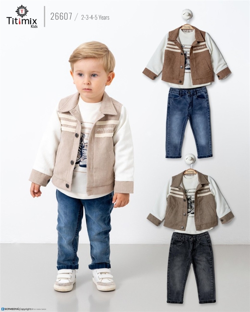 2/5 YAŞ-26607-26607 2/5YAŞ ŞERİT NAKIŞLI KADİFE CEKET ÜÇLÜ TAKIM